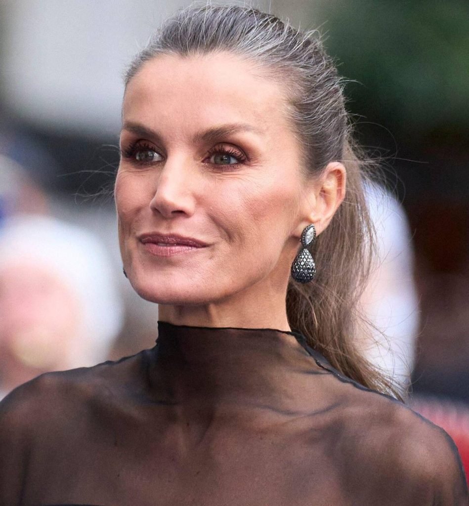 Для церемонии королева Летисия выбрала чёрное платье с прозрачным наслоением и дополнением в виде чёрно-белых бриллиантовых серьг от De Grisogono. Эти серьги — часть её коллекции-наследия, и они стали важным акцентом на официальном образе.