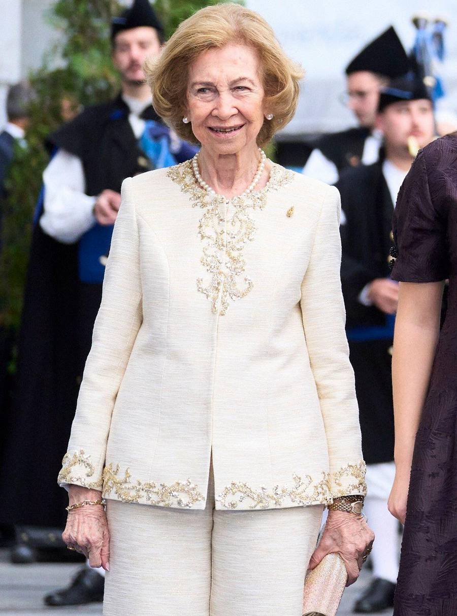 Королева София была элегантна в костюме с брючным силуэтом и украшениями из золота и жемчуга — образ отвечал её традиционному стилю.