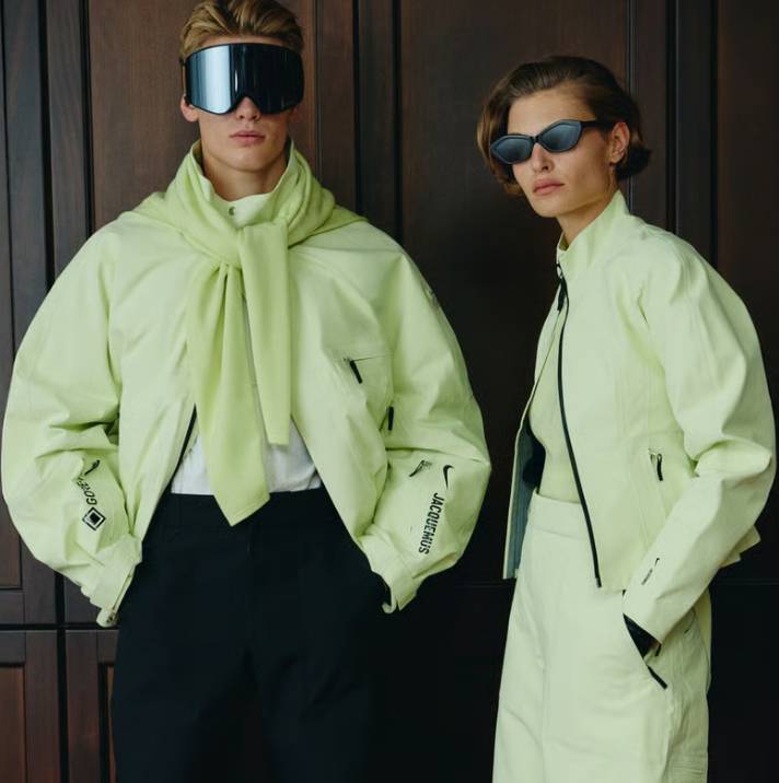 Nike и Jacquemus вновь объединили усилия, представив коллекцию одежды Après Ski, которая сочетает в себе техническую функциональность и провокационную, практичную и одновременно модную эстетику французского дизайнера. В коллекцию вошли 18 предметов, а её центральным элементом стала куртка 2-в-1 из материала Gore-Tex: водо- и ветрозащитная верхняя оболочка с аккуратными деталями кроя и утеплённая внутренняя бомбер-куртка на молнии. Вторая женская куртка выполнена из тех же защитных материалов, но её силуэт вдохновлён одной из фирменных моделей линии Jacquemus. Соответствующие брюки из Gore-Tex дополнены съёмными жаккардовыми ремнями и характерными петлями под ремень с буквой «J».