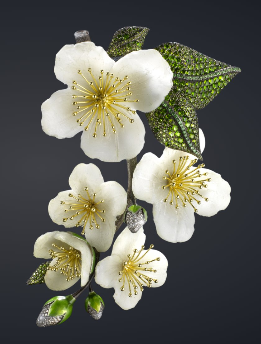 Эту брошь изготовила испанская ювелирная фирма Luz Camino. В описании отмечается, что дизайн вдохновлён веткой растения Philadelphus coronarius (более известного как английский кизильник или сладкий имитационный апельсин). Материалы включают белую смолу, эмаль, бриллианты, цавориты и хром-диопсид. Кроме того, королева уже владеет парой серёг того же дизайнера.